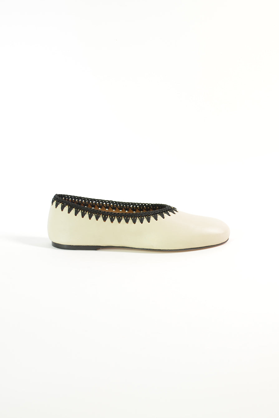 This creamy white flat is so soft and we love the beautiful black edge detail.
