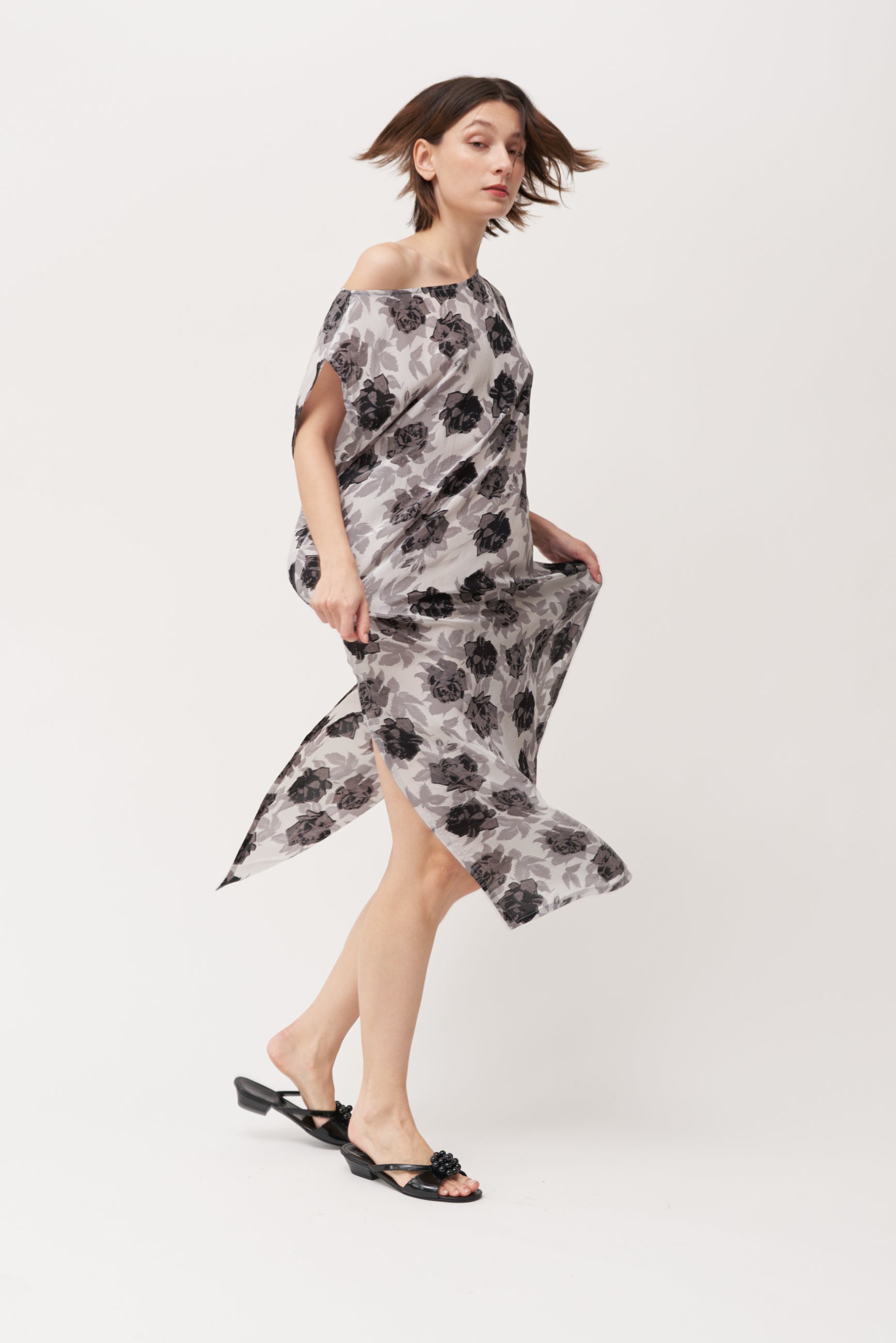 Slip-on sandal crafted with black leather with a slight gloss finish. Features a black resin appliqué on the vamp, a low Cuban heel, and a square open toe.