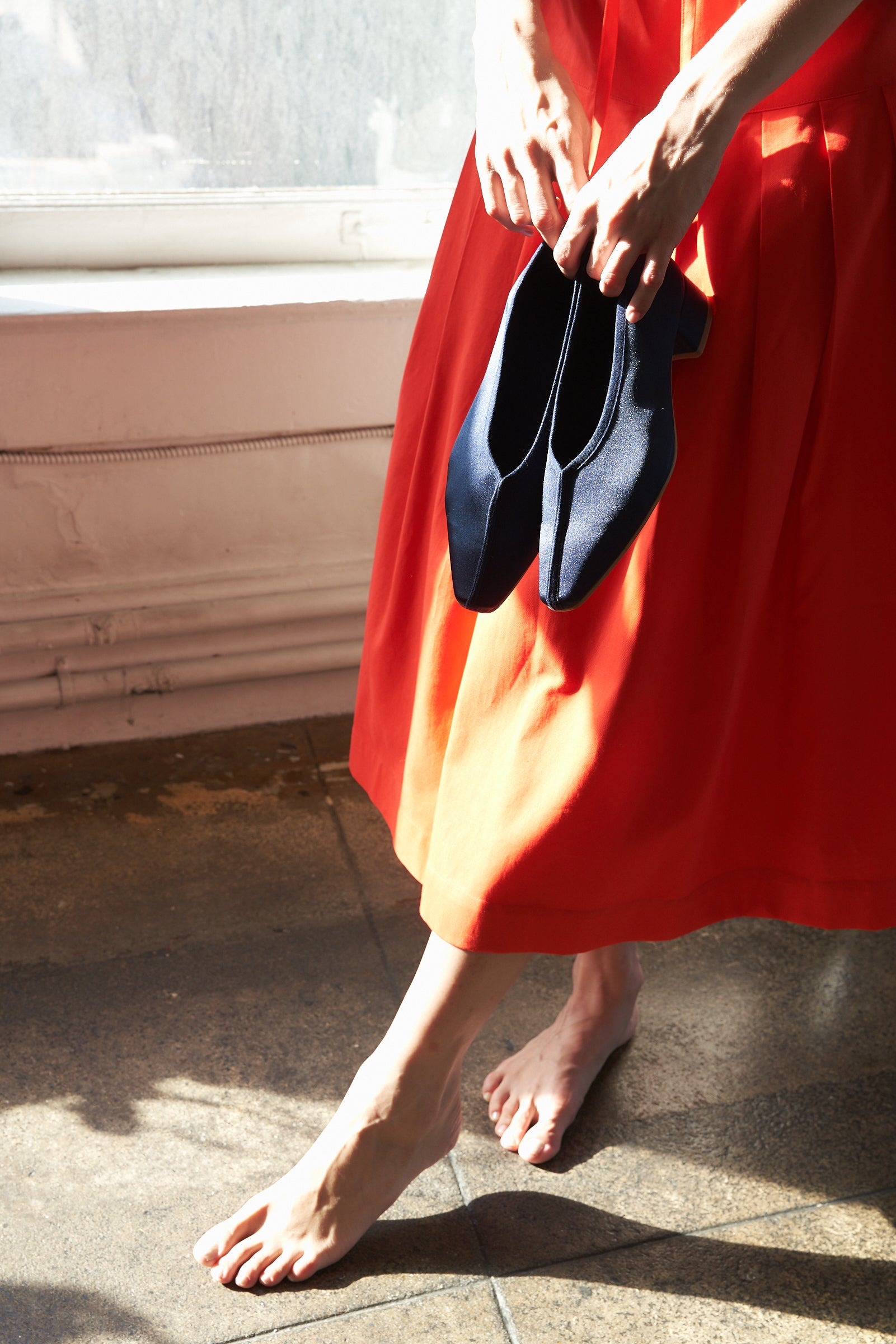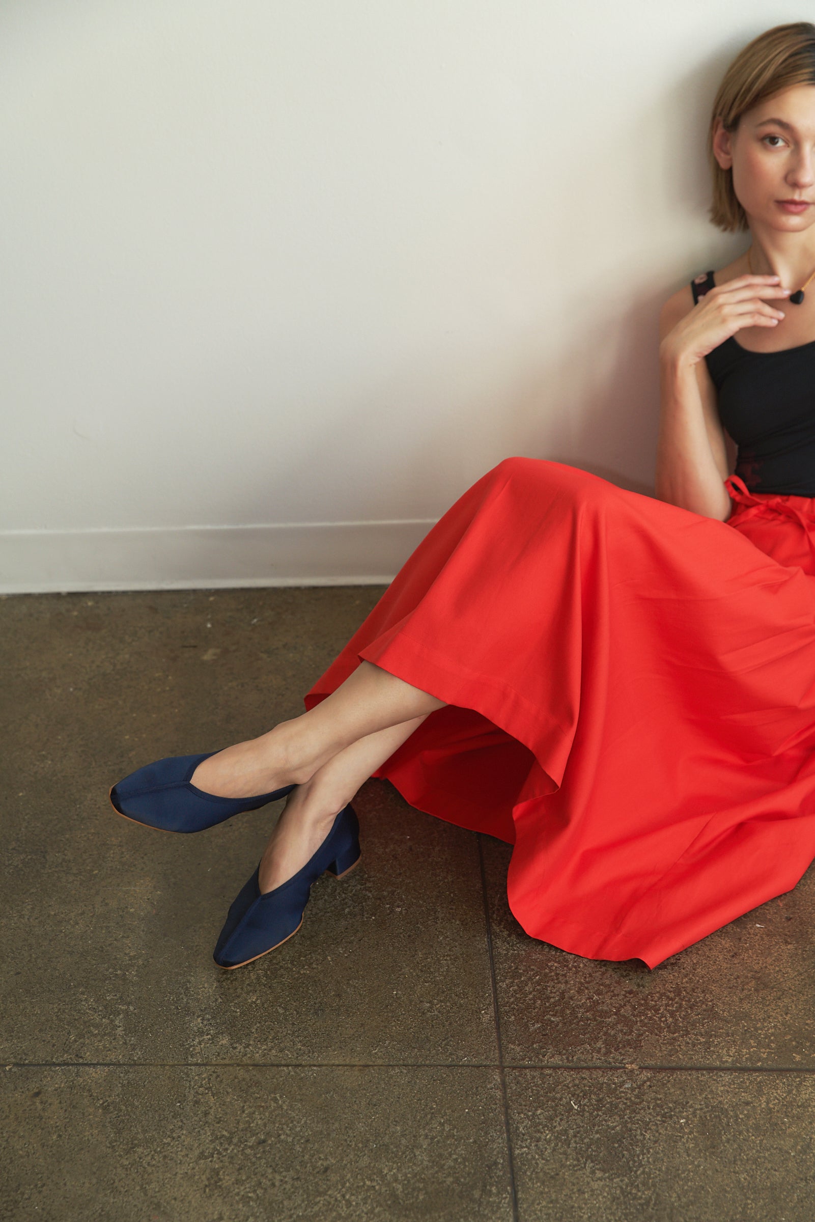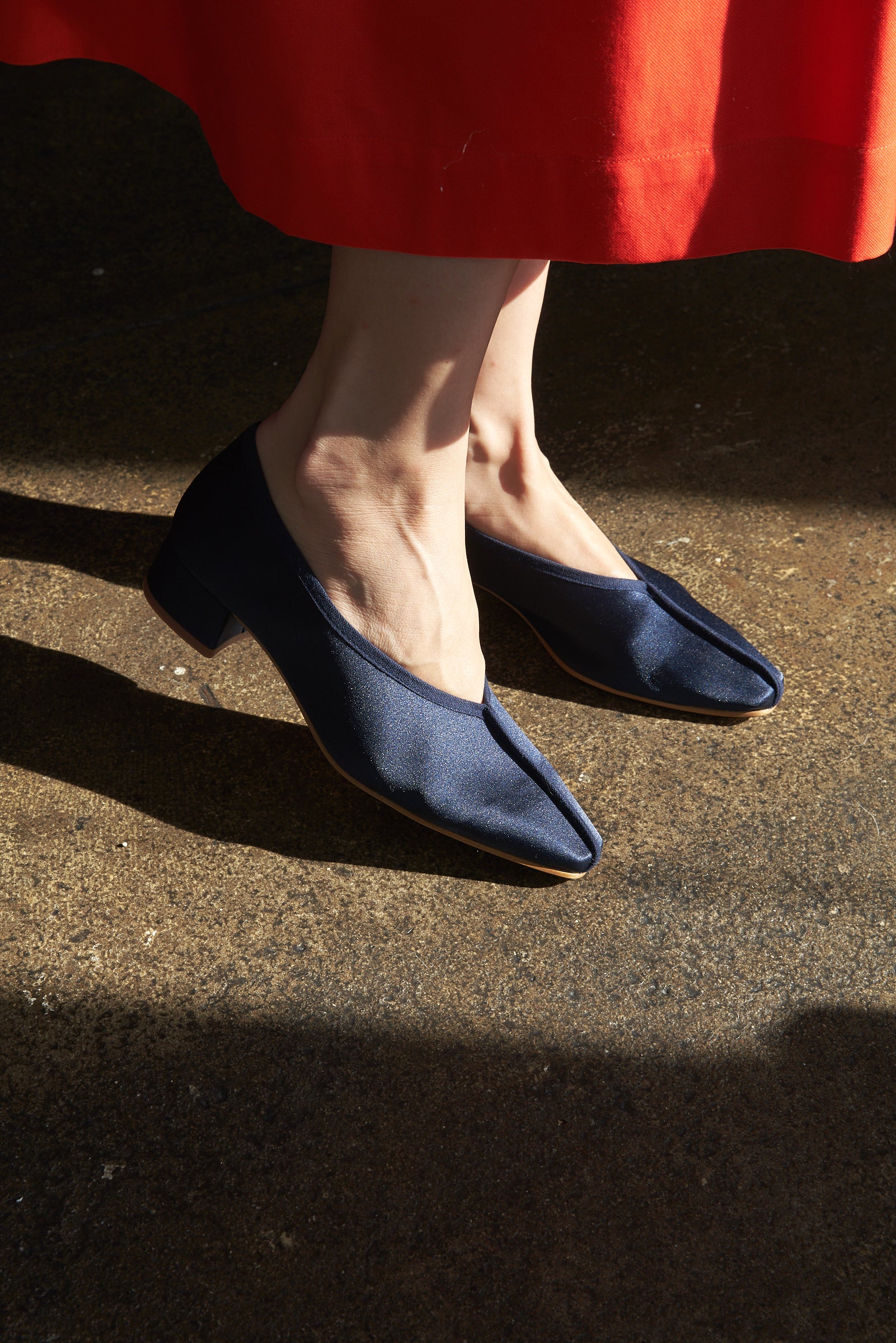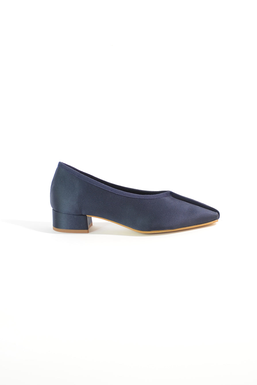 Drawing inspiration from classic dance footwear, this navy satin heel features striking front seam accents and a heel wrapped in matching satin fabric, creating a sleek, uninterrupted silhouette.